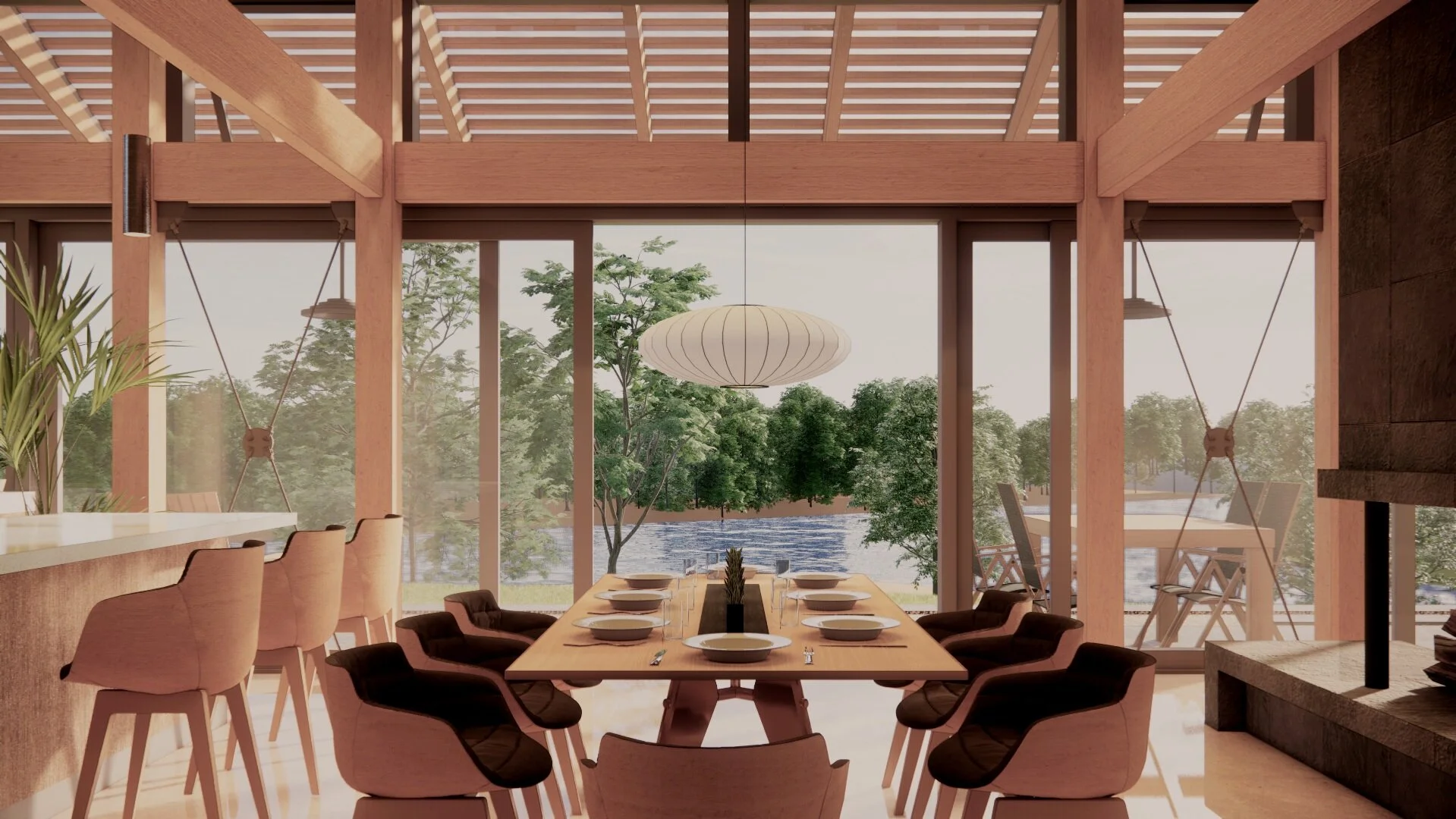 Open to the river side of the property, and dramatically revealed just beyond the entry foyer, is a year-round glass enclosed and light filled Adirondack style social hub; a tall timber framed singular space for family gathering around cooking, dining and relaxing. Full height windows on three sides offer a view up and down the Hudson River. Open sliding glass doors transforms the room into a three-season screened porch, where breezes can waft through, and family and friends can wander to and from the terrace, gardens and fields at the river’s edge.