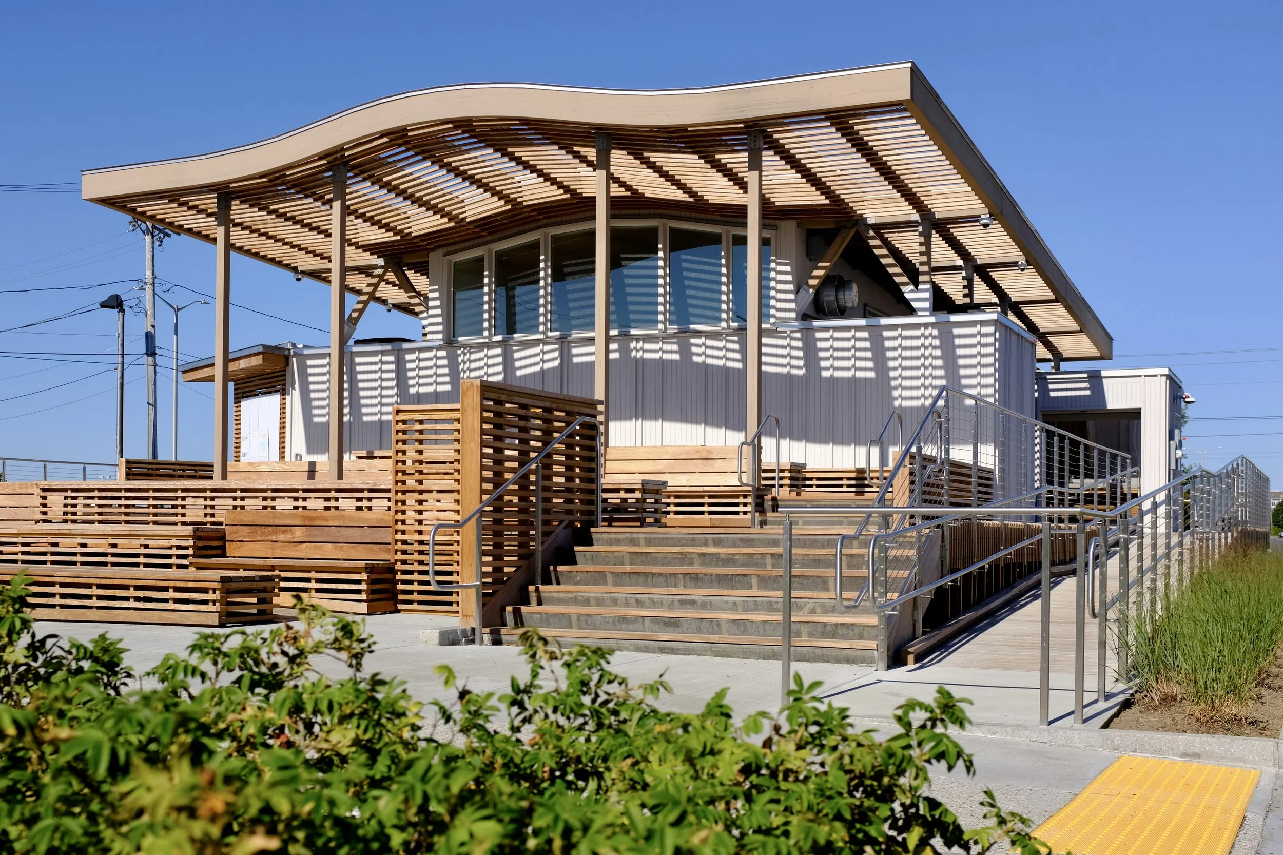 Reinforcing the arrival into a beachfront landscape, the planting palette employs native species hardy enough for this challenging climate. Given the proximity to the beach, both buildings have been elevated to mitigate flooding and facilitate dune migration. By including features such as terraced seating, information display, and raised circulation at the Mall, and a public picnic plaza and rinse stations at the corner, the buildings provide welcoming destinations whether approached to or from the beach.